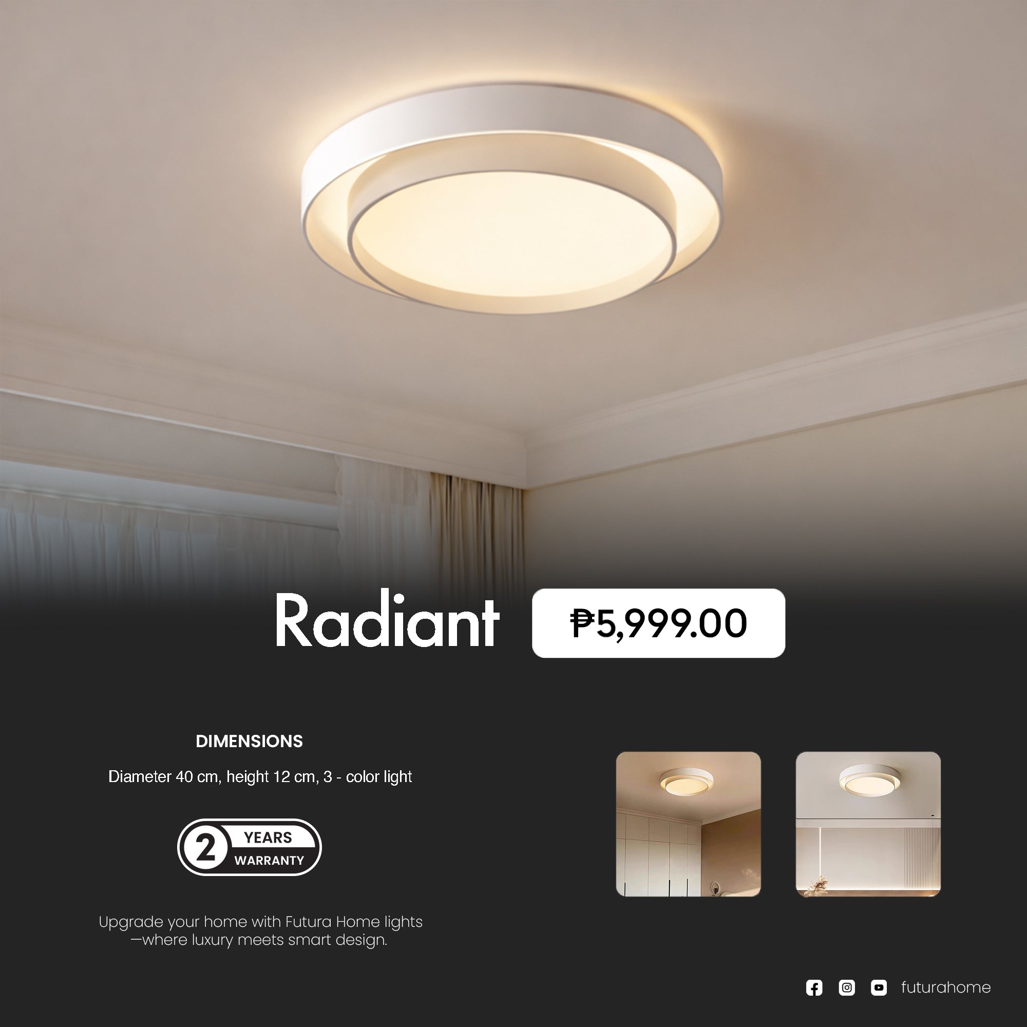 Illuminate your space with Futura Home’s Radiant Ceiling Light, designed to deliver modern elegance with everyday practicality. Crafted with premium materials and smart lighting technology, this fixture offers: